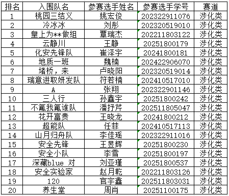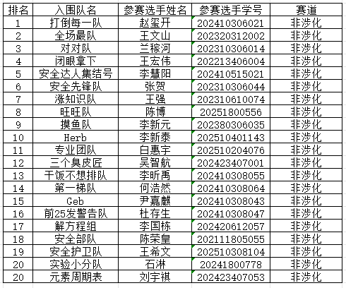 经过安全知识理论考核,按成绩由高到低排序,排名前20的队伍入围参加实操能力考核。入围队伍名单如下: